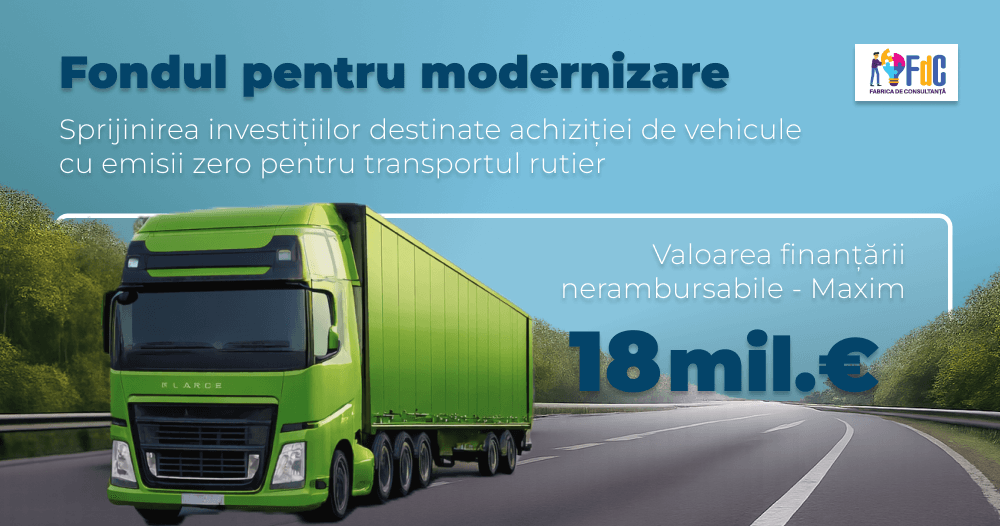 Fonduri Europene nerambursabile pentru Microintreprinderi Fondul pentru Modernizare în România Sprijinirea investițiilor destinate achiziției de vehicule cu emisii zero pentru transportul rutier Fondul pentru Modernizare în România Investiţii în noi capacităţi de producere a energiei electrice produsă din surse regenerabile pentru autoconsumul întreprinderilor din cadrul sectorului agricol și industriei alimentare Programul Regional Centru 2021-2027 Întreprinderi digitale pentru o economie avansată – sectoarele de specializare inteligentă Programul Tranziție Justă Investiții pentru dezvoltarea IMM care spijină creșterea durabilă și crearea de locuri de muncă DR16 – Investiții în sectorul legume și/sau cartofi Programul Regional București-Ilfov Apel dedicat sprijinului IMM pentru transformare digitală avansată